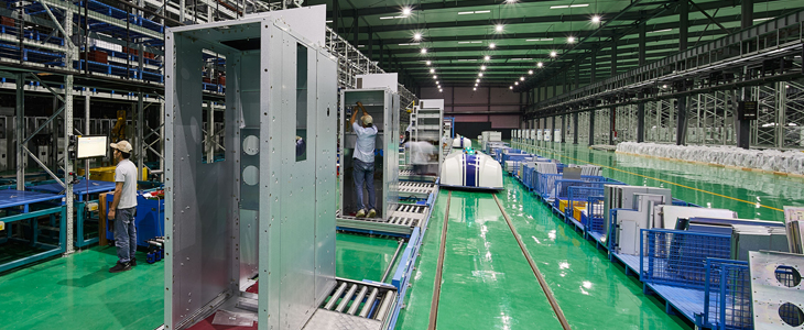 數(shù)字化工廠占地面積185畝,建筑面積5.8萬(wàn)平方米,共分兩個(gè)生產(chǎn)車間,中壓成套生產(chǎn)車間和低壓成套生產(chǎn)車間,主要設(shè)備和系統(tǒng)包括:配電設(shè)備柔性裝配線、鈑金柔性自動(dòng)化生產(chǎn)線、庫(kù)線一體化銅母線自動(dòng)加工線、二次線束自動(dòng)加工線,以及智能物流與倉(cāng)儲(chǔ)系統(tǒng)、能源管理系統(tǒng)、綜合監(jiān)控系統(tǒng)、數(shù)字化檢測(cè)系統(tǒng)等,具備年產(chǎn)5萬(wàn)面中低壓智能配電設(shè)備的能力,并實(shí)現(xiàn)公司產(chǎn)品在城市軌道交通等供電系統(tǒng)中的全壽命周期管理,成為聯(lián)通上游供應(yīng)商和客戶的數(shù)字化運(yùn)營(yíng)平臺(tái)。
